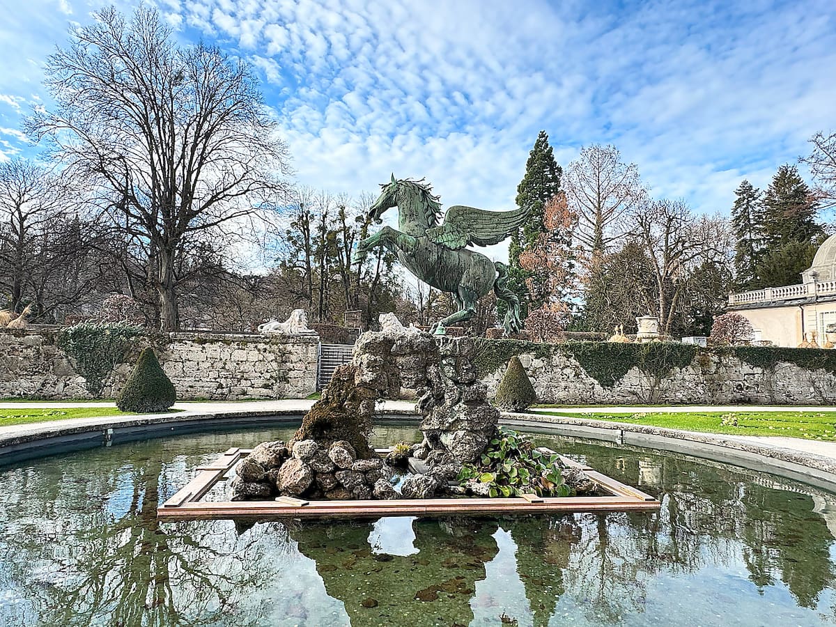 The gardens on site were strategically and geometrically situated and are decorated with mythological statues and beautiful flowers and shrubbery. Behind the Palace in the gardens is a Pegasus fountain. The figure made of copper was forged in 1661. Originally, the fountain sat in many squares around Old Town Salzburg until it was placed at Mirabell in 1913.