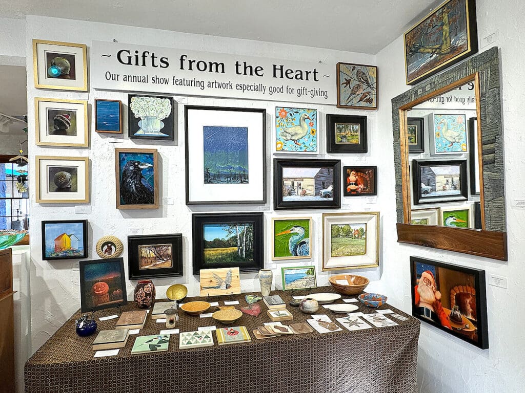In 1969, the grassroots art gallery, now known as Edgewood Orchard Galleries, opened its doors. Irene recounted opening day saying “We had no lights, but we had champagne.” Over the next few years, lights were added and wooden crates were traded out for actual display pedestals. The gallery is now owned by Anne and her husband Minnow’s daughter and son-in-law Nell. Today, the gallery changes its exhibits monthly and is home to work by over 150 artists. Many mediums are represented including paintings, sculpture, glass, clay, wood, and jewelry.