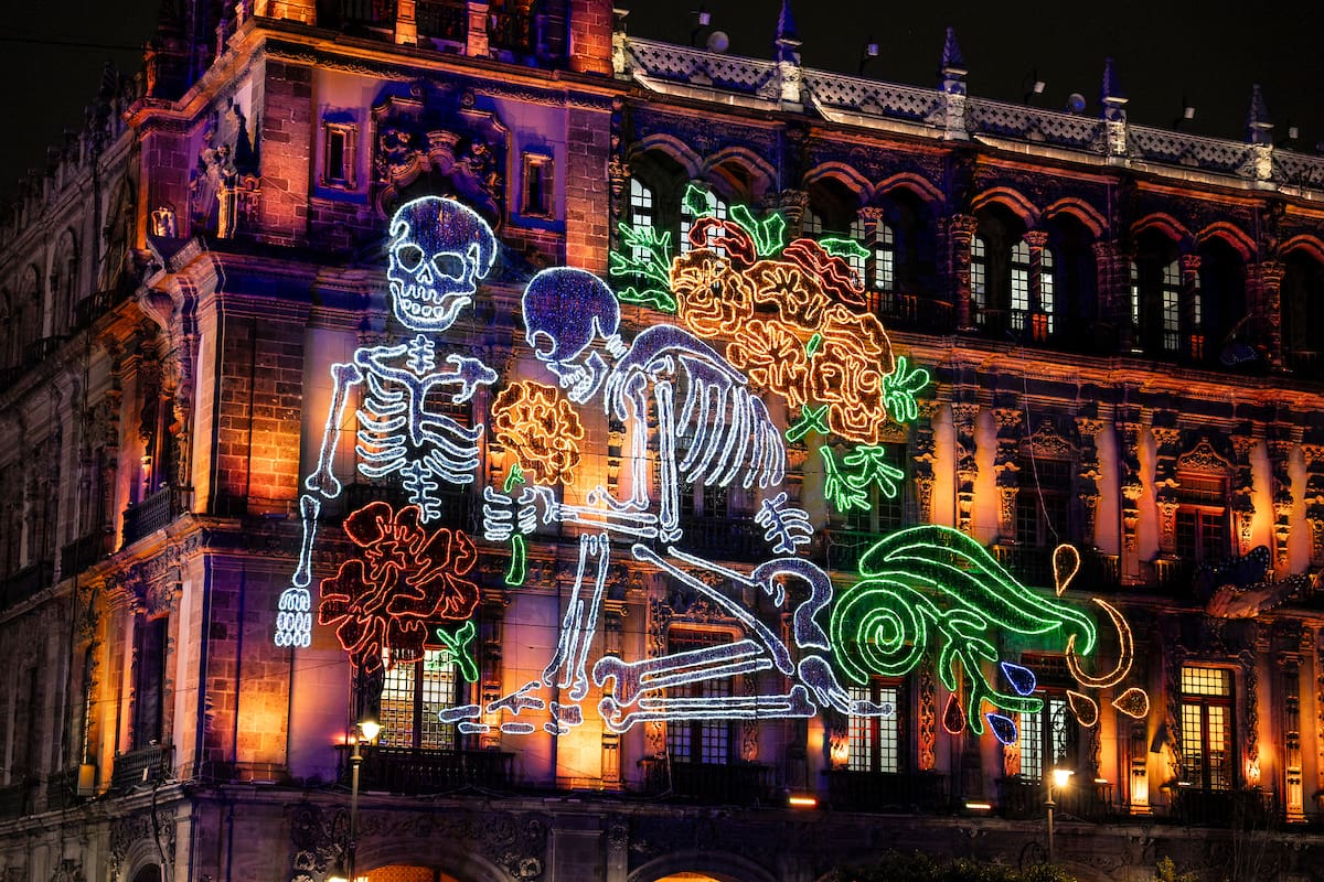 On October 31st, as night falls, thousands gather in the square around 7 p.m., surrounded by illuminated skeleton figures, towering sugar skulls, and arches of light. The atmosphere brings a mix of quiet reverence and joy, offering a chance to feel close to departed loved ones. The lights and decorations create a surreal ambiance, transforming the square into a sacred space, where the veil between worlds feels thinner and the presence of those who have passed is tangible.