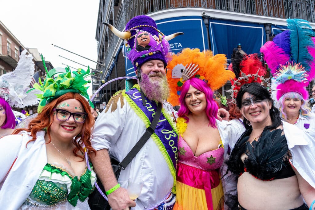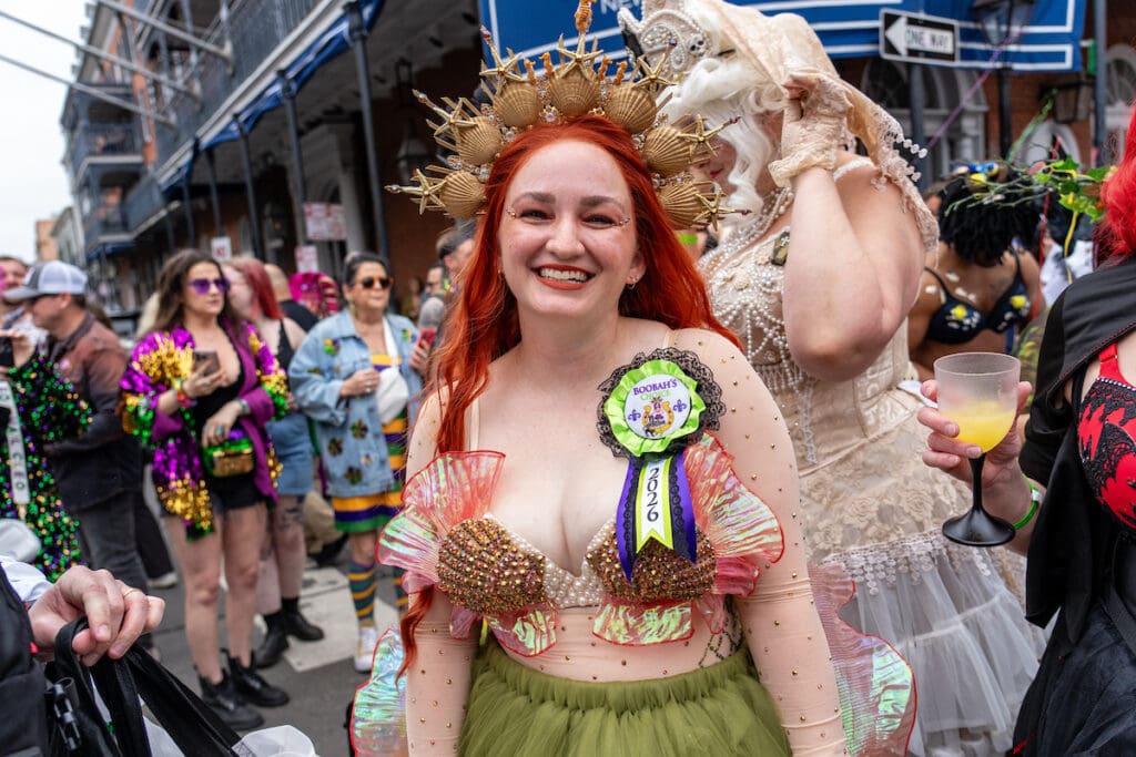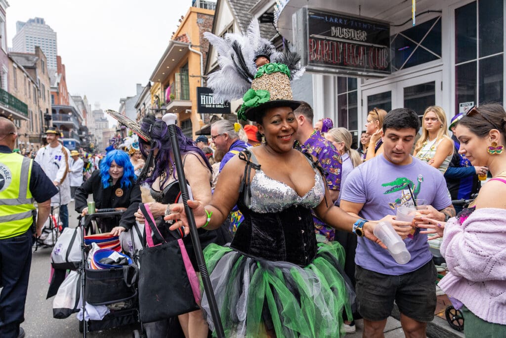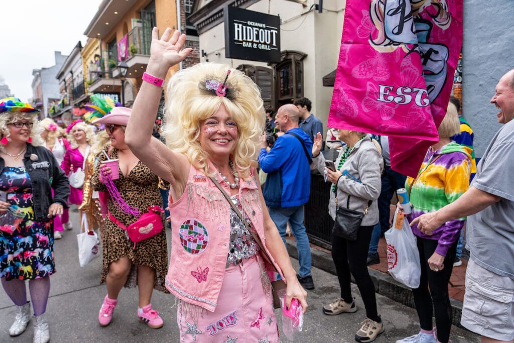 Before stepping off, the krewe gathered at 11:15 a.m. for toasts and a short ceremony, a moment to celebrate friendship and reveal costumes—and cleavage—before hitting the streets. From there, the parade loop began at Bourbon and Conti streets, winding its way down Toulouse, Royal, and Bienville. The route may have been compact, but the energy was anything but small.