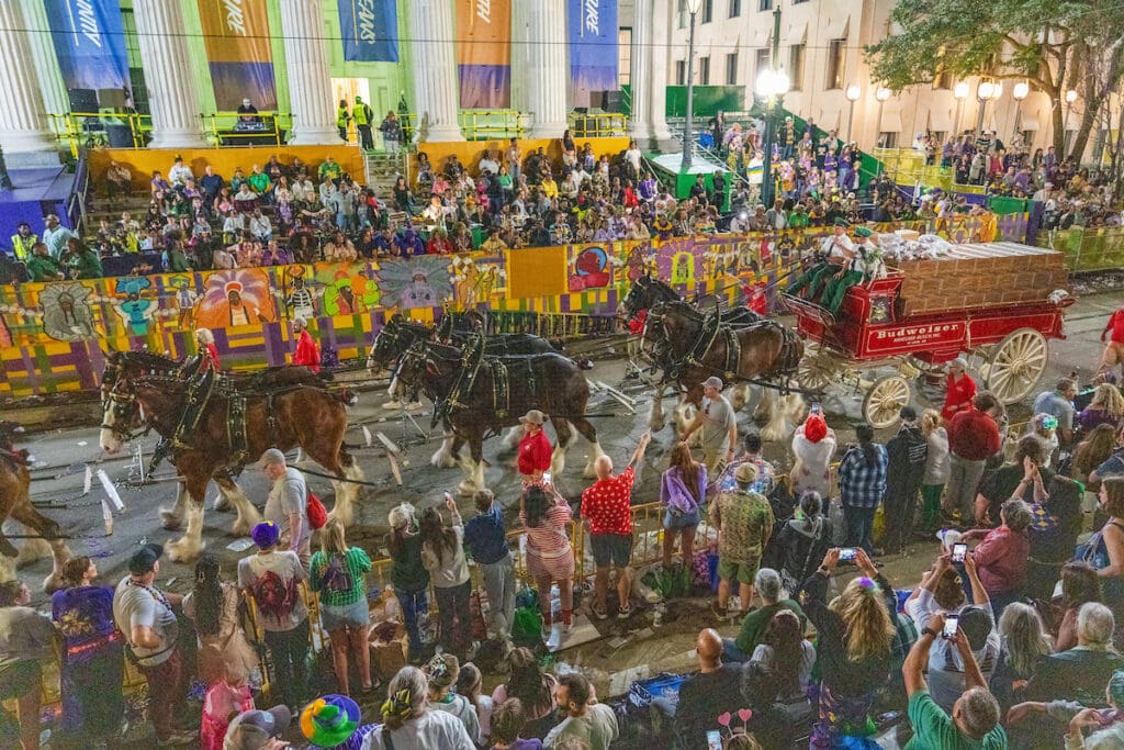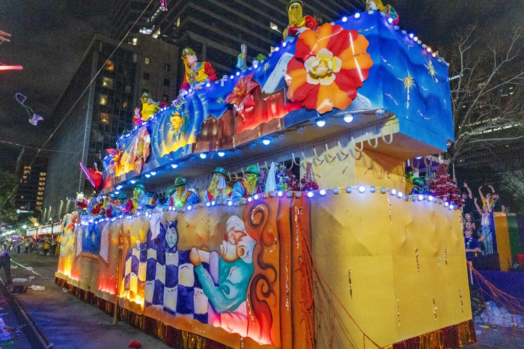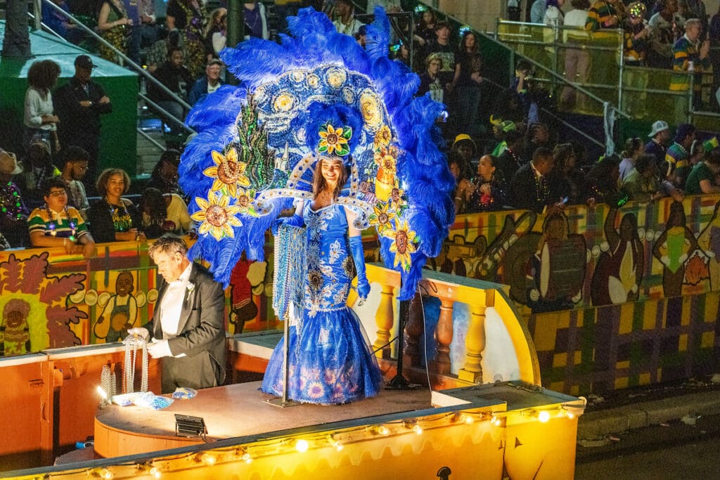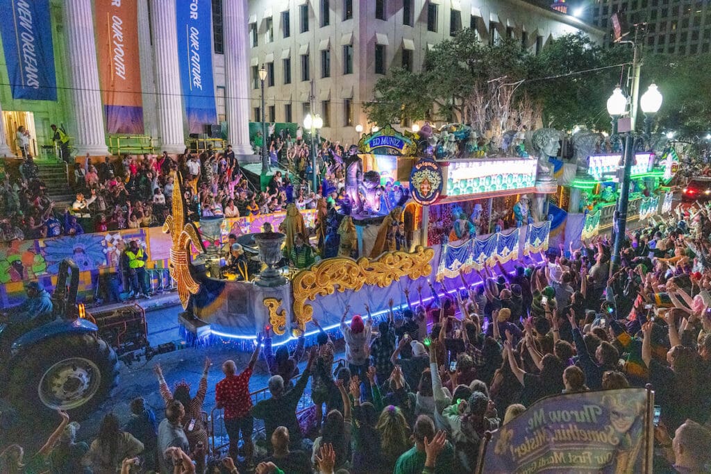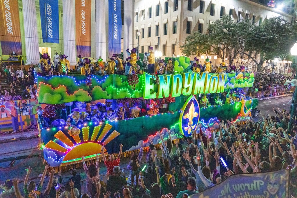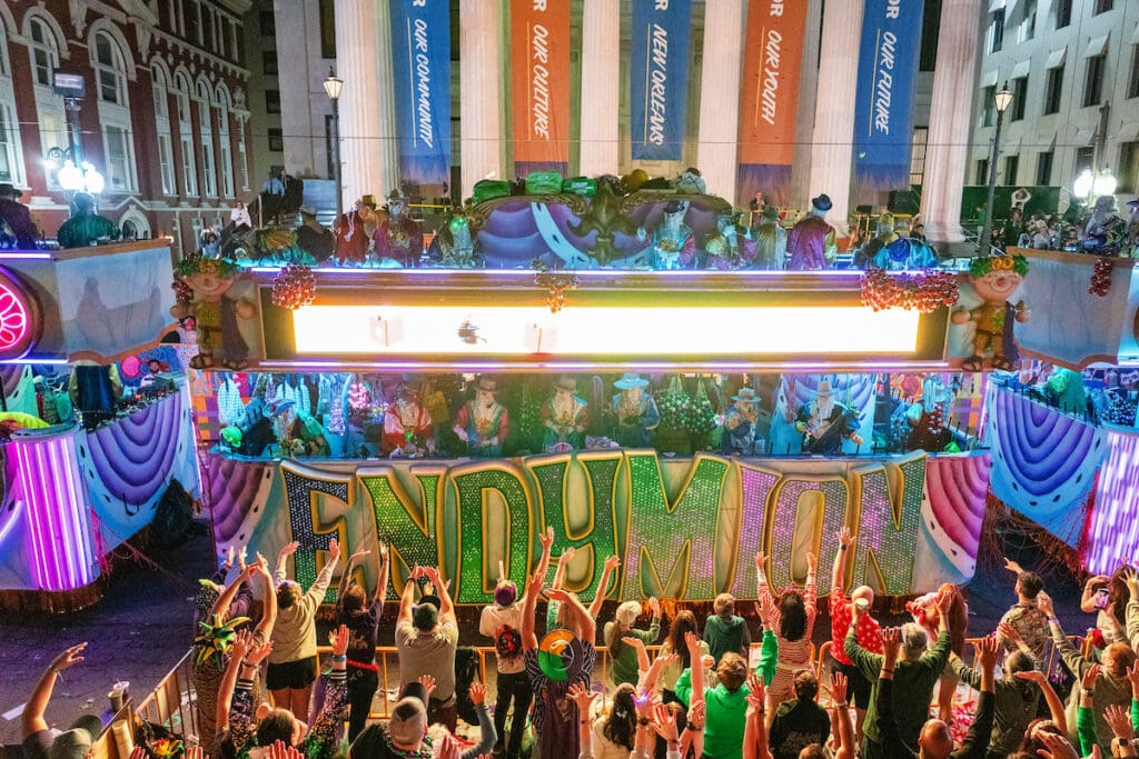 Founded in 1967, Endymion has grown into one of Carnival’s legendary “Super-Krewes.” It reached that status in 1974 when it expanded its float count and began inviting celebrity guests, forever changing the scale of Mardi Gras parades. Today, with roughly 3,200 riders and dozens of floats—many built as tandems that stretch the spectacle even farther—Endymion stands as one of the largest and most extravagant parades of the season. Its motto, “Throw ‘til it Hurts,” is more than a catchy line; the krewe estimates it tosses over 15 million throws along the route each year.
