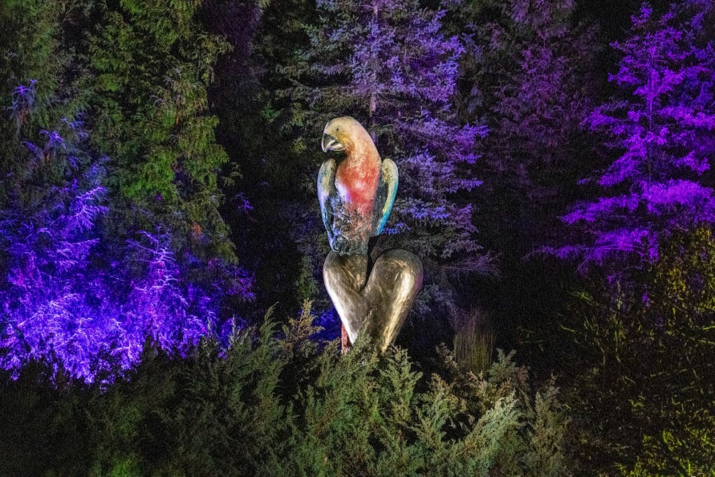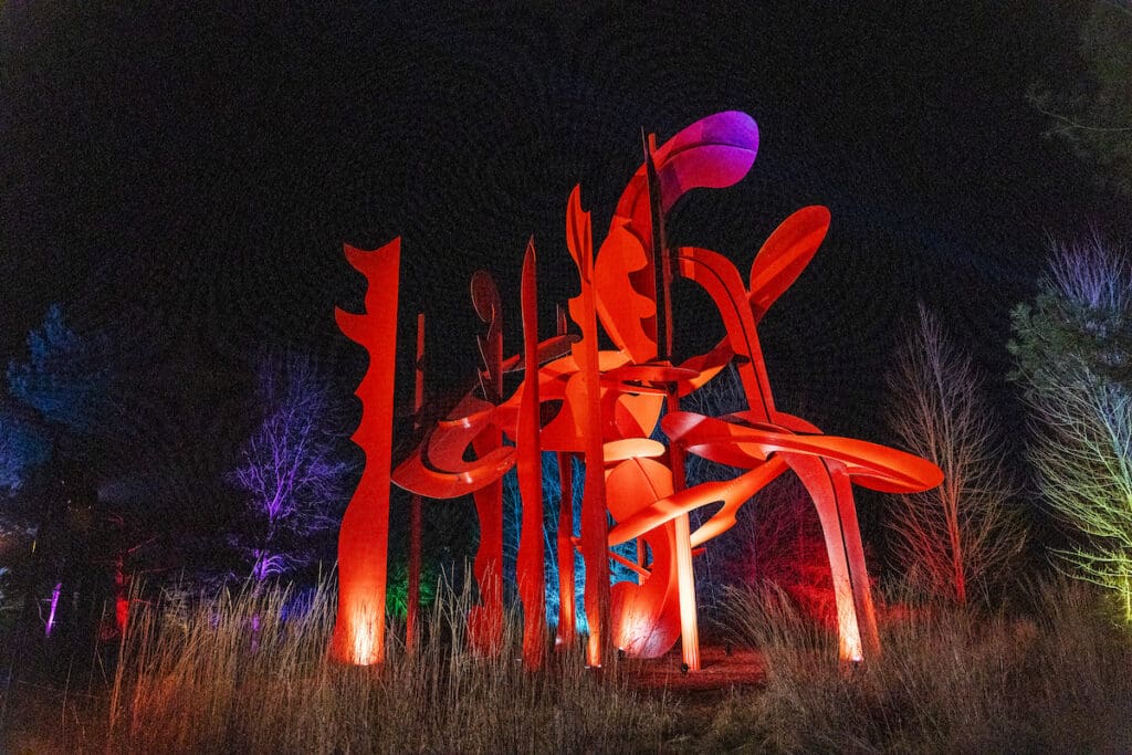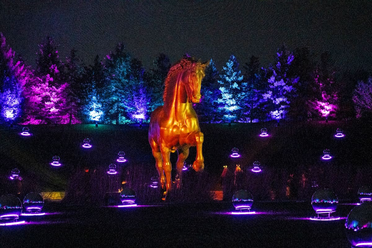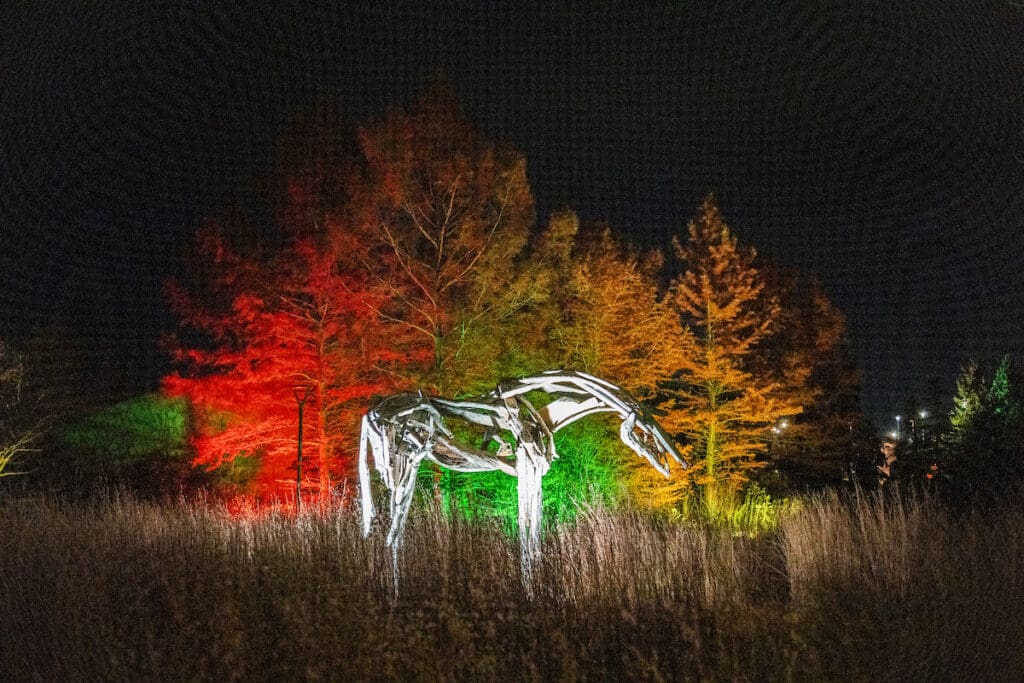 As the sun sets, the Meijer Gardens Amphitheater becomes the gateway to a glowing winter journey. Guests stroll along a curated, one-mile path that weaves through gardens, forested areas, and open lawn spaces — all transformed by light. Sculptures by renowned artists, including massive works like The American Horse by Nina Akamu and Scarlatti by Mark di Suvero, take on new life under LED illumination, lasers, and color-changing projections and create a magical interplay between art and environment.