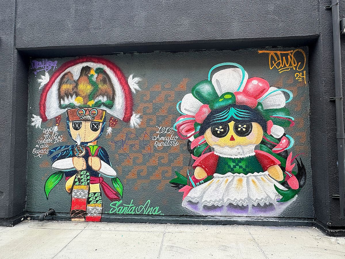 Another heavily visited group of murals is “La Raza” created by artists George Ruiz, Gilbert Rodarte, Steve Martinize, Roger Montenegro and Jaime Varella. The mural can be found in 5 panels at the corner of N. Hawley St. and W. Civic Center Dr. The panels capture two Quetzalcoatl’s, Aztec warriors, the phrase “La Raza” (which means “The People”), and other symbols of Chicano culture. As of 2024, the mural was completely restored after 7 years of community work. Other non-Chicano related murals and street art feature nature, messages of peace and love, religious symbols, depictions of sports stars, and geometric designs. New murals and completed renovations are revealed year-round. Next time you’re in Santa Ana, be sure to admire all the time, effort, and appreciation of culture that has gone into this canvas of a city.