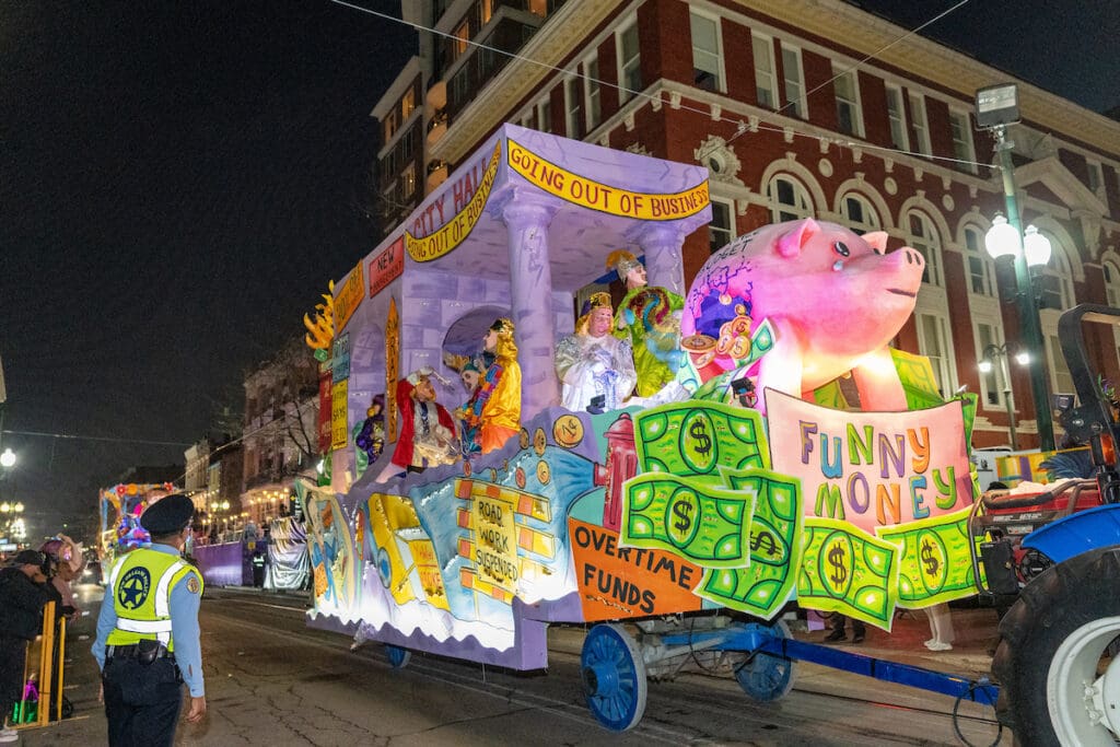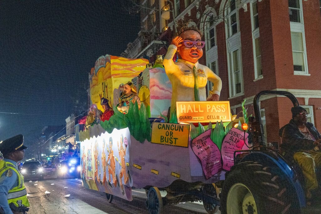 This year’s parade delivered a full-scale Carnival roast aimed squarely at Washington DC, New Orleans City Hall, Baton Rouge, and beyond. Float after float rolled by with elaborate, often outrageous designs that skewered politicians, public officials, institutions, and scandals with equal-opportunity irreverence. The laughter from the crowd came fast and loud as spectators tried to take it all in before the next punchline rolled into view.