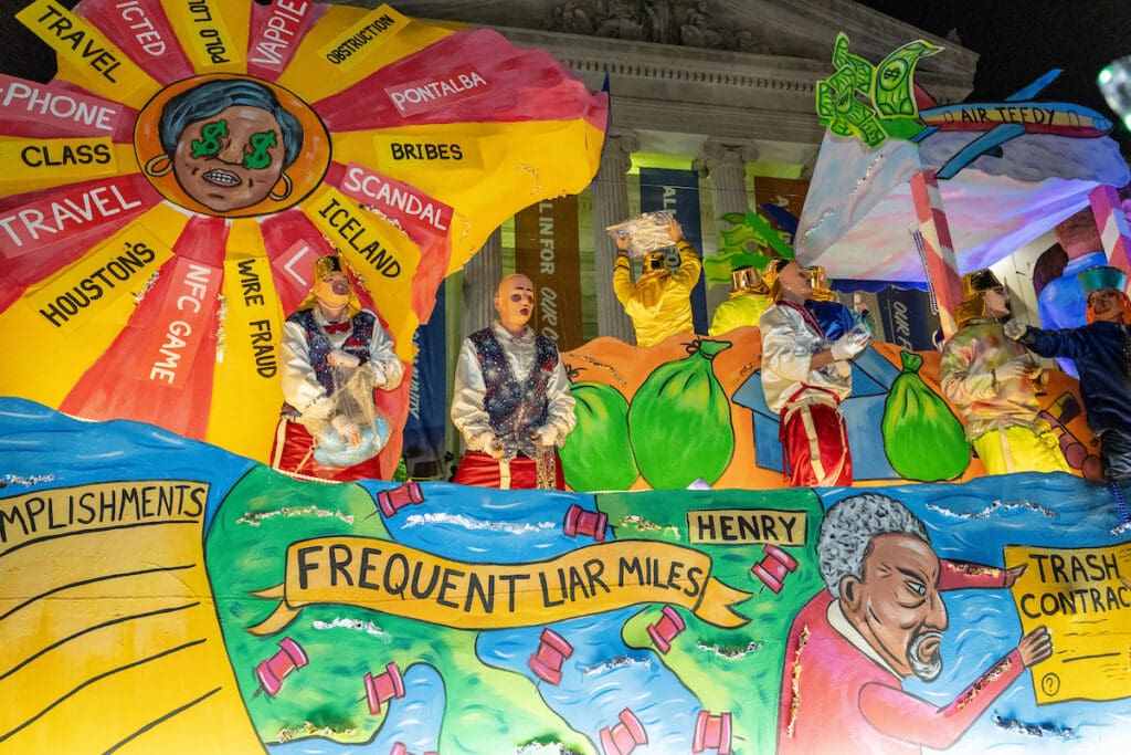 National politics fared no better. Floats roasted President Donald Trump alongside Speaker of the House Mike Johnson, while other designs targeted U.S. Secretary of Defense Pete Hegseth and U.S. Secretary of Homeland Security Kristi Noem in a depiction that left the crowd gasping and laughing in equal measure. A float lampooning U.S. Secretary of Health and Human Services Robert F. Kennedy Jr. turned his food advocacy into Carnival absurdity, while another mocked the U.S. government’s dramatic destruction of alleged drug cartel speedboats.