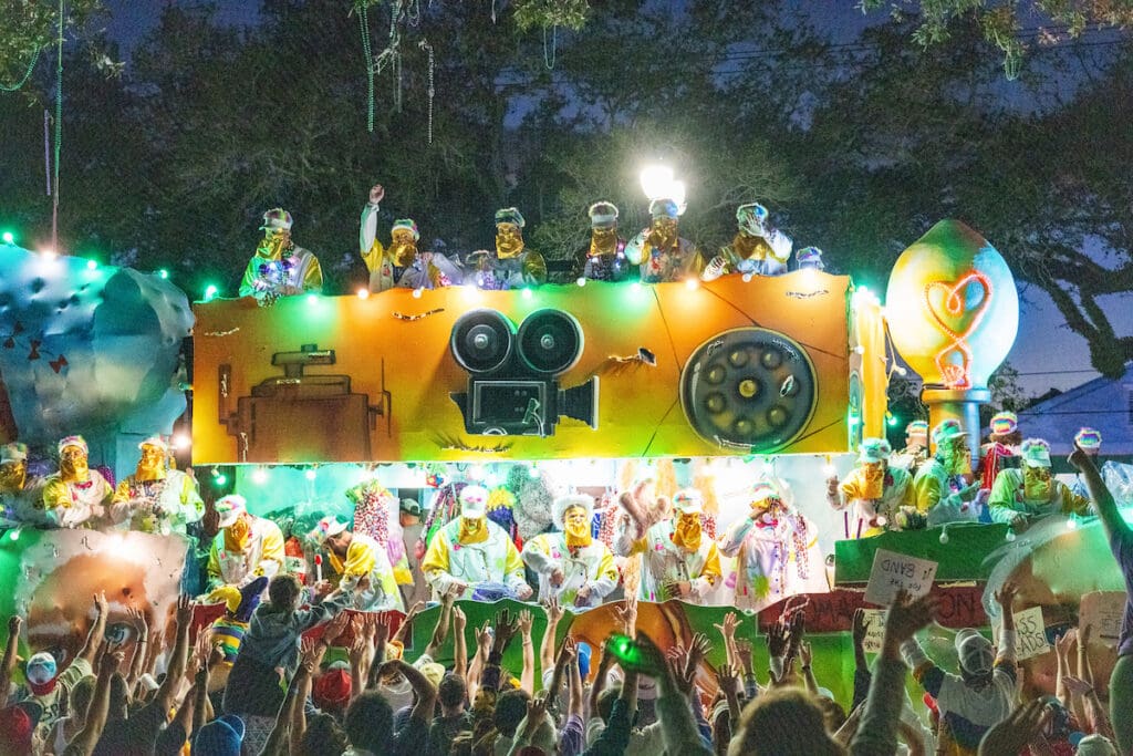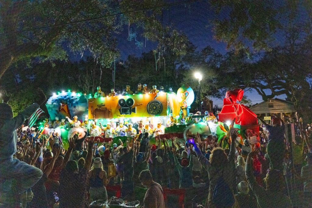 This year, the honor of reigning over one of the most celebrated super krewe parades in the country went to actor Patrick Warburton, best known for his scene-stealing roles in Seinfeld, Family Guy, and A Series of Unfortunate Events. Warburton brought the larger-than-life charisma that Bacchus demands, and he worked the crowd masterfully as the parade rolled down St. Charles Avenue under the Sunday evening sky.