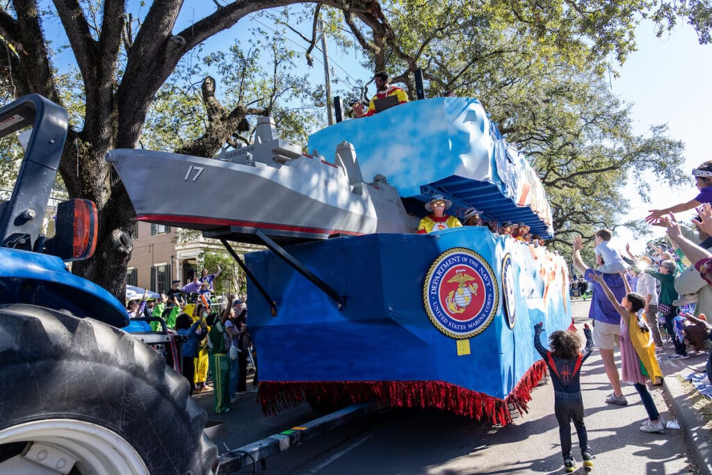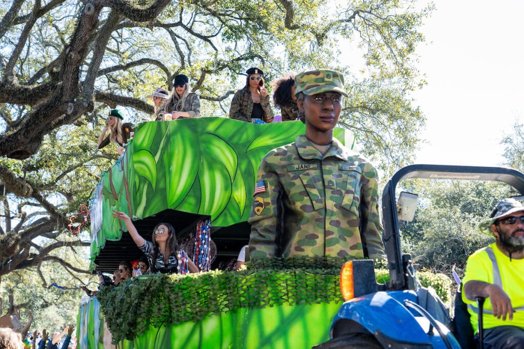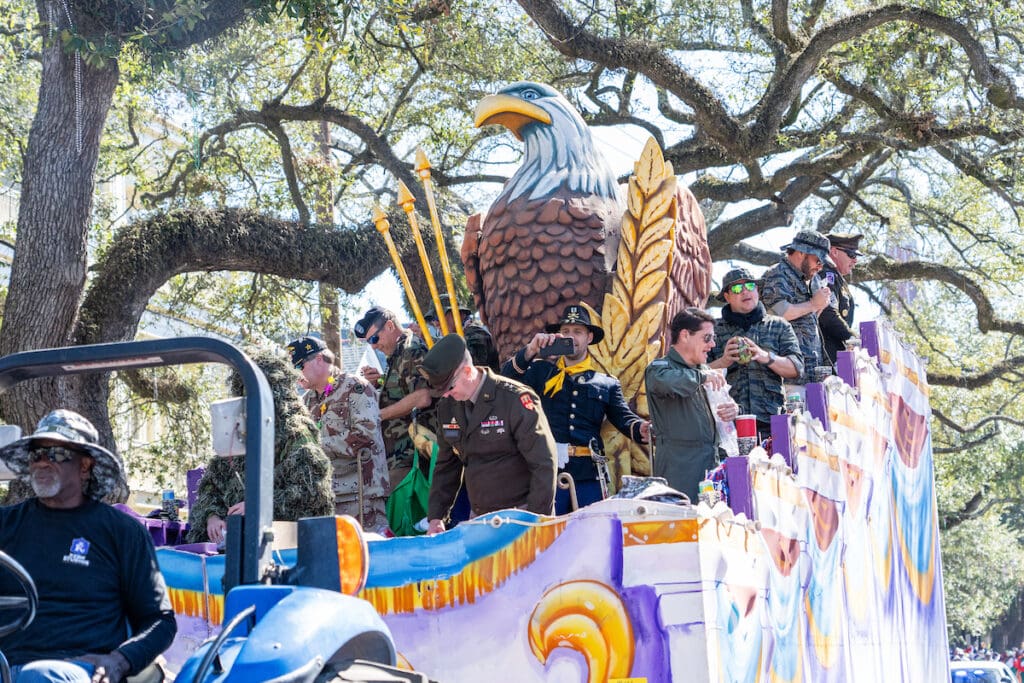 Beyond parade day, the Legion of Mars is deeply committed to year-round philanthropy tied to its mission. The krewe regularly participates in military-focused charitable efforts, including feeding veterans at the VA hospital on Veterans Day. Its members also step up to support active military, veterans, and first responders during times of need—whether responding to natural disasters or assisting individuals facing hardship. That ongoing commitment adds depth to what unfolds on the parade route, turning a single day of celebration into a reflection of sustained service.