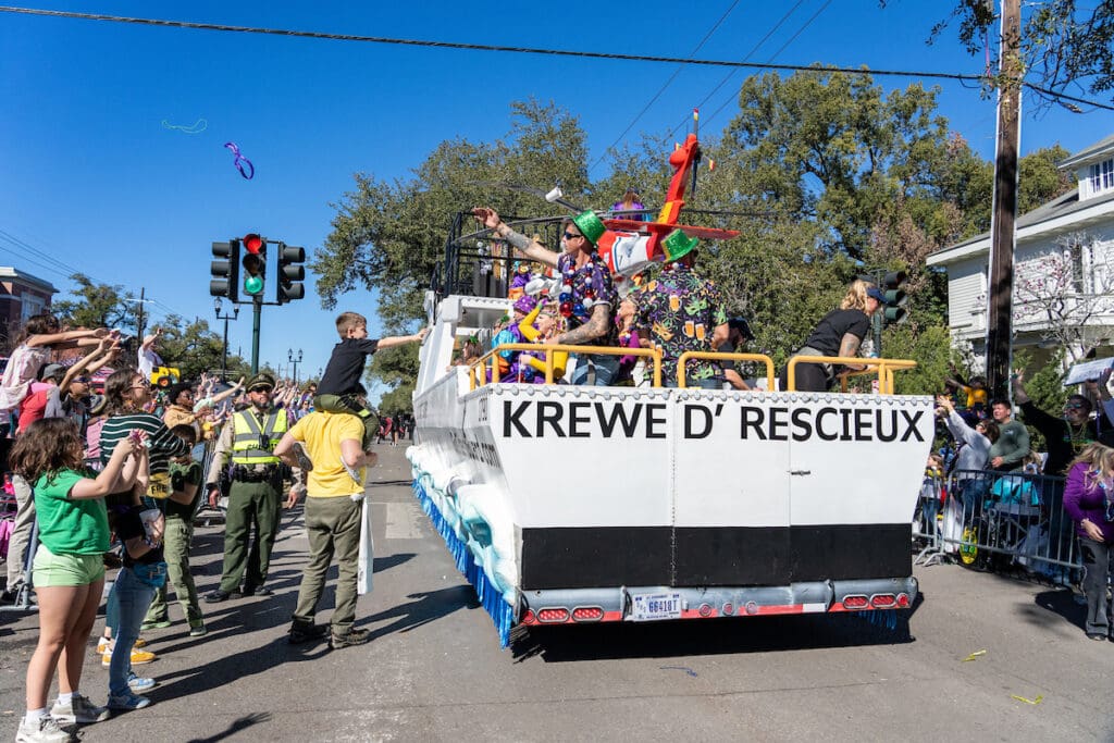 One of the most moving moments of the parade came with a float carrying Purple Heart recipients—Wounded Warriors—who rode free of charge thanks to the support of community sponsors and the krewe itself. As the float passed, applause rippled through the crowd, turning stretches of the route into spontaneous standing ovations. It was a reminder that Mardi Gras, at its best, is not just about spectacle, but about shared respect and collective acknowledgment.