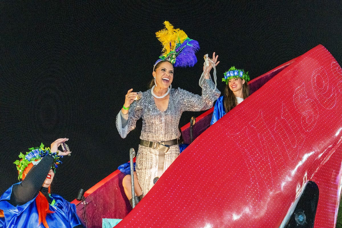 At the very front of the parade rode the 2026 Honorary Muse, Soledad O’Brien, perched high in the krewe’s iconic 17-foot-tall, fiber-optic red high-heel shoe. Each year, Muses selects a distinguished woman with deep New Orleans connections who embodies the spirit of the krewe, and O’Brien’s career as a journalist, storyteller, and advocate made her a natural choice. From her elevated vantage point, she waved to cheering crowds who understood exactly what that towering shoe represents: visibility, empowerment, and celebration of women who inspire. At her stop at Gallier Hall to toast the mayor she was also given the Key to the City of New Orleans.