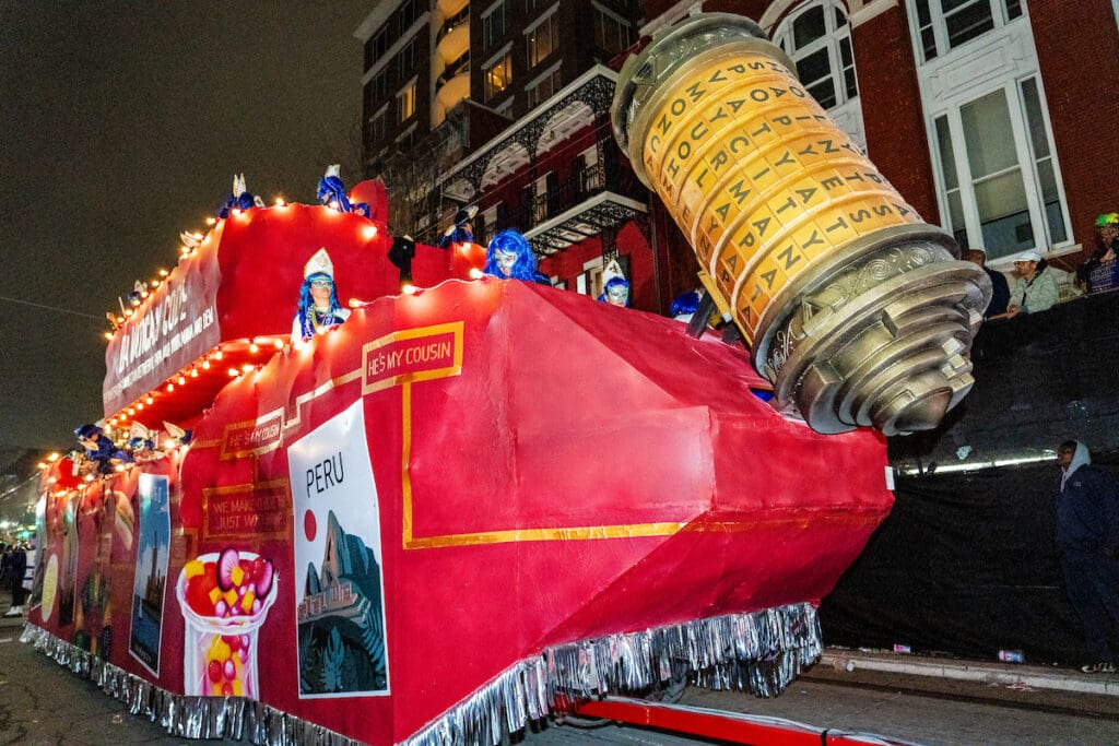 Float 12, Da Vatican Code, showcased the krewe’s ability to blend current events, global intrigue, and pop culture into a single, layered spectacle. Inspired by The Da Vinci Code, the float referenced the selection of Pope Leo XIV last year, playfully weaving in nods to his Creole heritage, Chicago roots, and background in Peru. The result was clever, dense with references, and exactly the kind of float that rewards spectators who pay close attention.