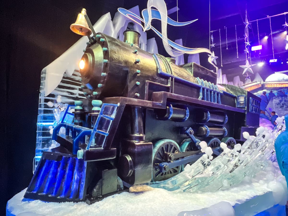 The artisans behind this magical ICE! display traveled all the way from Harbin, China to Nashville, Tennessee to create these ice carvings. They spent over 12,000 hours carving and sculpting 9 different Polar Express scenes. The entire process took about 6 weeks of hand-carving 6,000 blocks of ice. You can even see a live carving experience from one of the artisans during the tour through the exhibit.