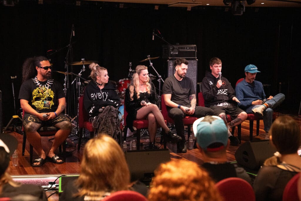 Mental health and songwriting became a central theme as the discussion continued. Aaron Bruno described music as the only thing that consistently makes sense to him. Bryan Garris emphasized that Knocked Loose always writes together, often retreating away from distractions to create, and that the process has helped him learn how to confront personal and uncomfortable topics. Dustin Bates explained that while he sometimes has to force himself to write, the mental health benefits often come as a byproduct of building concepts and sonic worlds. The Pretty Wild shared their collaborative songwriting process through shared notes files, allowing constant communication and vulnerability—an approach that heavily influences their debut album. Shepherds Reign spoke about honoring their ancestors and Samoan culture through music, using songwriting as a way to process life itself.