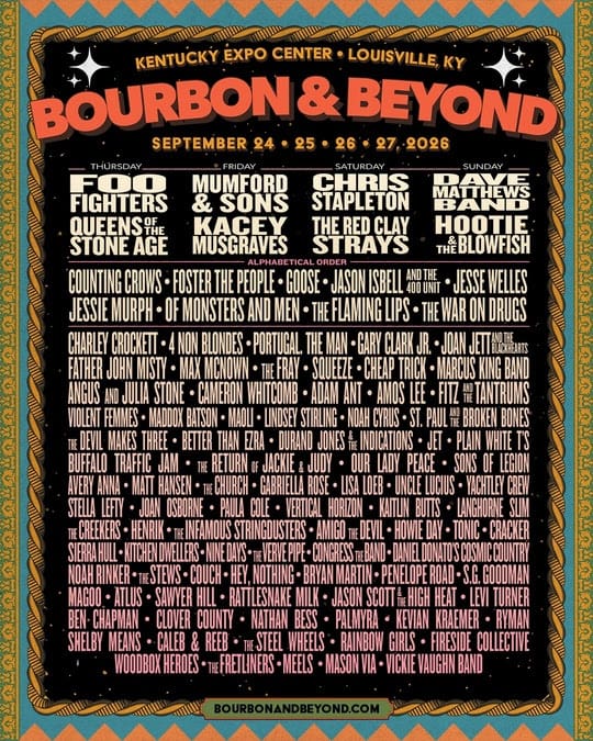 Bourbon & Beyond, the World’s Largest Bourbon, Food & Music Festival returns to the Kentucky Exposition Center from September 24-27th. The 2026 festival features over 100 artists, including Foo Fighters, Mumford & Sons, Chris Stapleton and Dave Matthews Band.