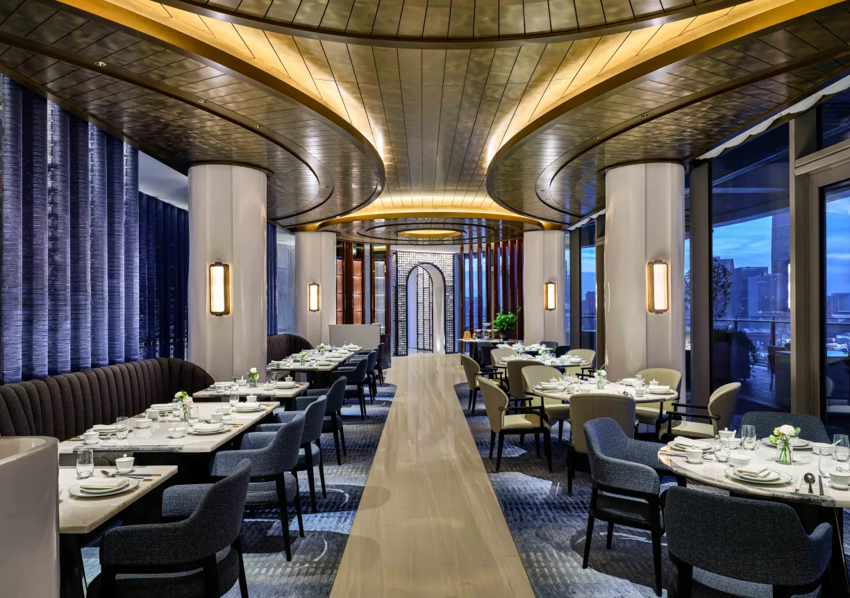 Atop the hotel, Fu Cheng, led by Chef Justin Yang, serves Modern Min cuisine inspired by Quanzhou traditions. The space features a contemporary expression of traditional Shanghai architecture, inspired by the tranquil waterways surrounding the hotel. With its elegant curves and bespoke details, Fu Cheng offers a refined space perfect for intimate gatherings and grand events.